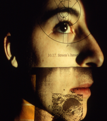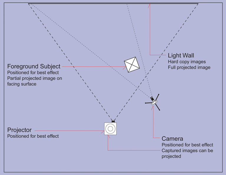 This image above as well as the banner for this web site have been created by using a re-photographic method. Media is hung on an image wall; a primary subject is placed in front of the image wall; a projection is thrown over the image wall and primary subject. The primary subject, camera and/or projector are placed for maximum desired effect. Captured images can be then re-projected/re-photographed. |